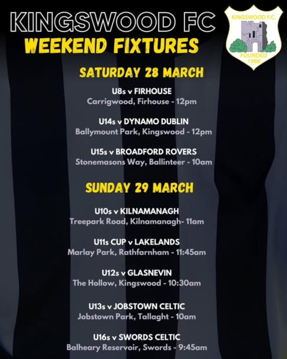 At Kingswood FC, we are dedicated to providing a high-quality football experience for our community in Kingswood Heights Dublin. Our team fixtures and groups are carefully organized to ensure a fun and competitive environment for all players. Join us for exciting games and a strong sense of camaraderie among fellow football lovers.